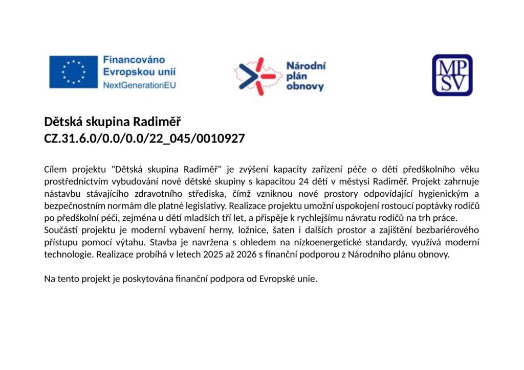 STAVEBNÍ ÚPRAVY BÝVALÉ HORNÍ MŠ Č.P.316 NA BYTY V RADIMĚŘI je spolufinancován Evropskou unií.